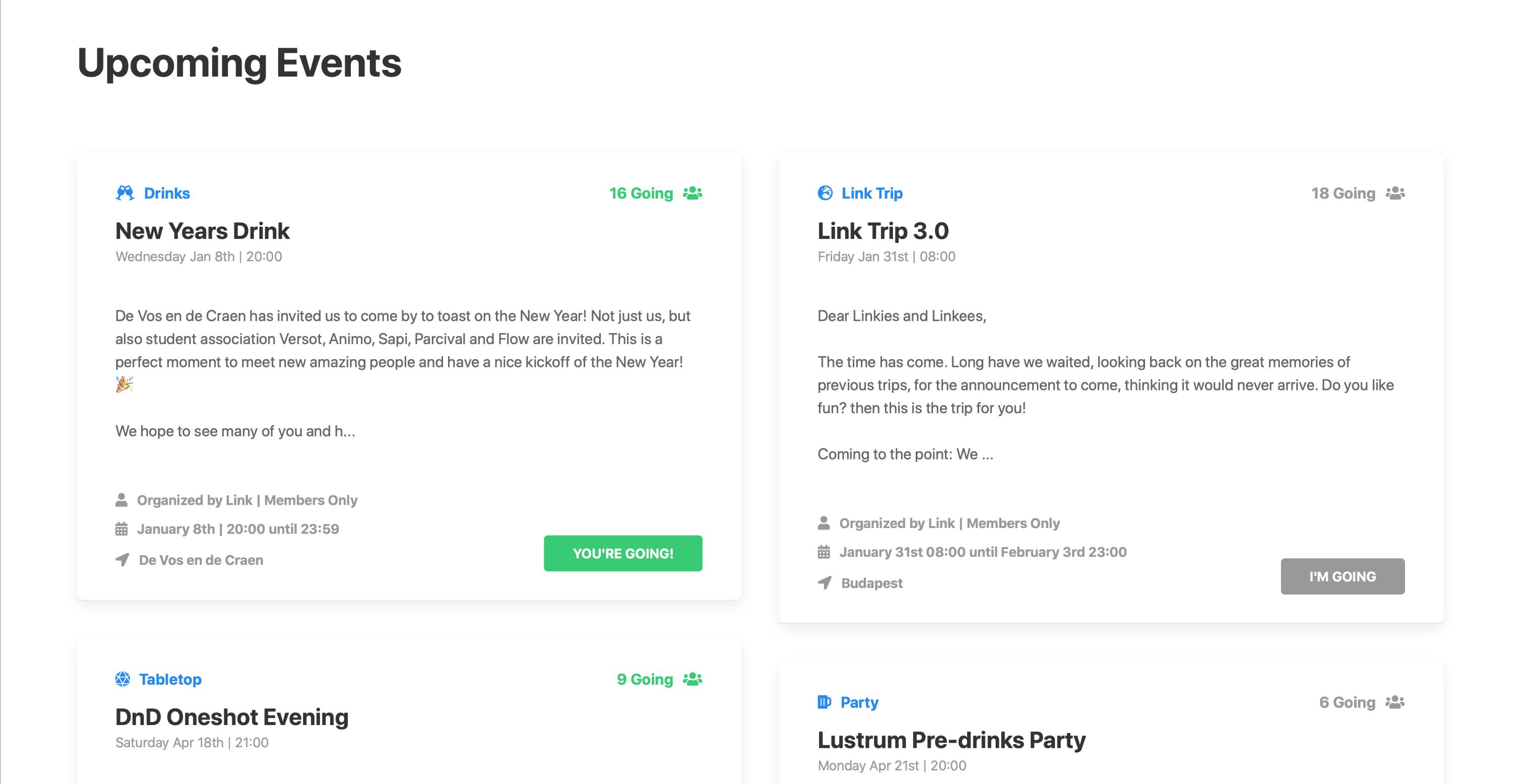 Other social events we organise include anime-nights, boardgame evenings, Tilburg Night University, poker nights, ice skating, randomly eating sushi, you name it! Oh, and we organise a Link-trip every year - for example last year we went to Prague!